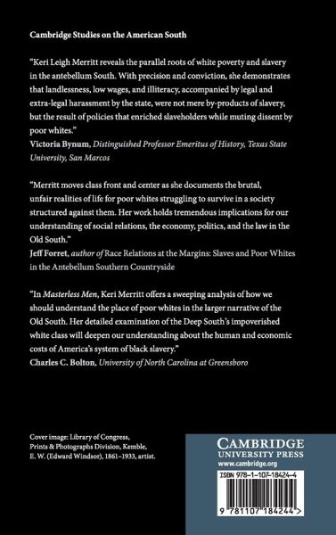 Analyzing land policy, labor, and legal history, Keri Leigh Merritt reveals what happens to excess workers when a capitalist system is predicated on slave labor. With the rising global demand for cotton - and thus, slaves - in the 1840s and 1850s, the need for white laborers in the American South was drastically reduced, creating a large underclass who were unemployed or underemployed. These poor whites could not compete - for jobs or living wages - with profitable slave labor. Though impoverished whites were never subjected to the daily violence and degrading humiliations of racial slavery, they did suffer tangible socio-economic consequences as a result of living in a slave society. Merritt examines how these 'masterless' men and women threatened the existing Southern hierarchy and ultimately helped push Southern slaveholders toward secession and civil war.