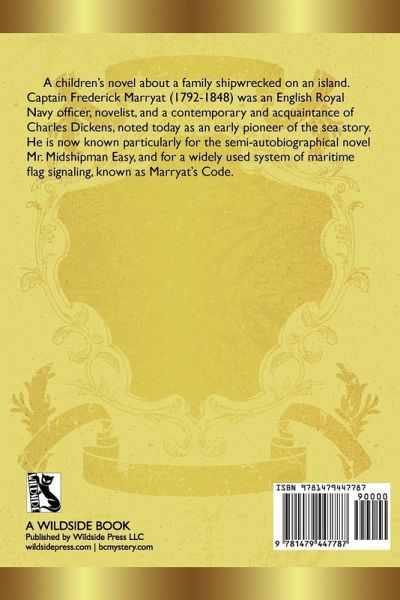 A children's novel about a family shipwrecked on an island. Captain Frederick Marryat (1792-1848) was an English Royal Navy officer, novelist, and a contemporary and acquaintance of Charles Dickens, noted today as an early pioneer of the sea story. He is now known particularly for the semi-autobiographical novel Mr. Midshipman Easy, and for a widely used system of maritime flag signaling, known as Marryat's Code.