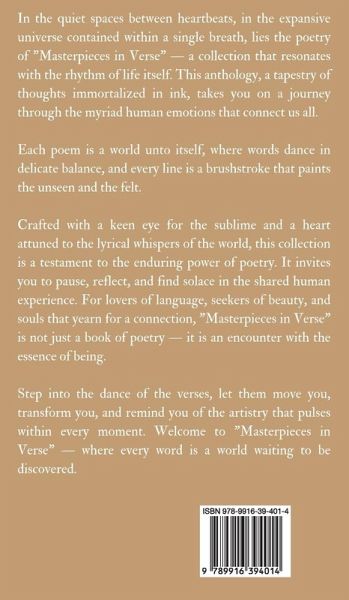 In the quiet spaces between heartbeats, in the expansive universe contained within a single breath, lies the poetry of "Masterpieces in Verse" - a collection that resonates with the rhythm of life itself. This anthology, a tapestry of thoughts immortalized in ink, takes you on a journey through the myriad human emotions that connect us all. Each poem is a world unto itself, where words dance in delicate balance, and every line is a brushstroke that paints the unseen and the felt. Crafted with a keen eye for the sublime and a heart attuned to the lyrical whispers of the world, this collection is a testament to the enduring power of poetry. It invites you to pause, reflect, and find solace in the shared human experience. For lovers of language, seekers of beauty, and souls that yearn for a connection, "Masterpieces in Verse" is not just a book of poetry - it is an encounter with the essence of being. Step into the dance of the verses, let them move you, transform you, and remind you of the artistry that pulses within every moment. Welcome to "Masterpieces in Verse" - where every word is a world waiting to be discovered. © 2023 Book Fairy Publishing