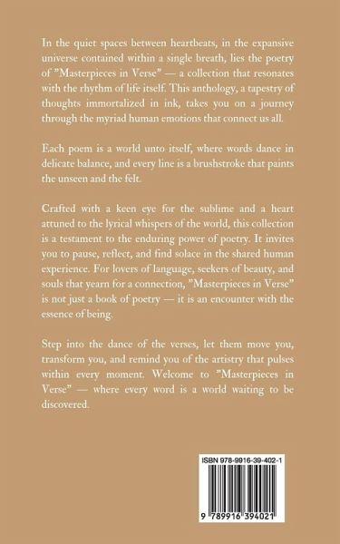 In the quiet spaces between heartbeats, in the expansive universe contained within a single breath, lies the poetry of "Masterpieces in Verse" - a collection that resonates with the rhythm of life itself. This anthology, a tapestry of thoughts immortalized in ink, takes you on a journey through the myriad human emotions that connect us all. Each poem is a world unto itself, where words dance in delicate balance, and every line is a brushstroke that paints the unseen and the felt. Crafted with a keen eye for the sublime and a heart attuned to the lyrical whispers of the world, this collection…mehr