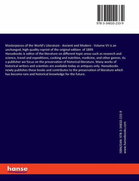 Masterpieces of the World's Literature - Ancient and Modern - Volume VII is an unchanged, high-quality reprint of the original edition of 1899.Hansebooks is editor of the literature on different topic areas such as research and science, travel and expeditions, cooking and nutrition, medicine, and other genres. As a publisher we focus on the preservation of historical literature. Many works of historical writers and scientists are available today as antiques only. Hansebooks newly publishes these books and contributes to the preservation of literature which has become rare and historical knowledge for the future.