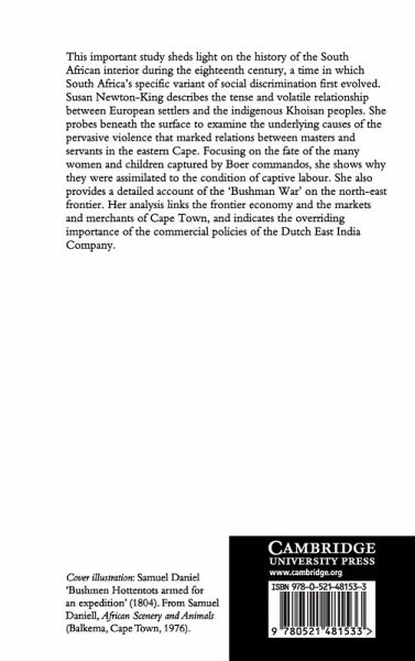 This important study sheds light on the history of the South African interior during the eighteenth century, virtually a lost century in South African historiography, and yet one in which South Africa's specific variant of social discrimination first evolved. Susan Newton-King describes the tense and volatile relationship between European settlers and the indigenous Khoisan peoples. She probes beneath the surface to examine the underlying causes of the pervasive violence that marked relations beween masters and servants in the eastern Cape. Focusing on the fate of the many women and children captured by Boer commandoes, she shows why they were assimilated to the condition of captive labour. She also provides the first detailed account of the'Bushman war' on the north-east frontier. Her analysis links the frontier economy and the markets and merchants of Cape Town, and indicates the overriding importance of the commercial policies of the Dutch East India Company.