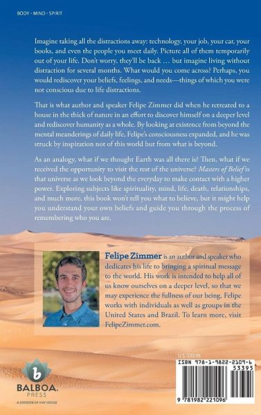 Imagine taking all the distractions away: technology, your job, your car, your books, and even the people you meet daily. Picture all of them temporarily out of your life. Don't worry, they'll be back. But imagine living without distraction for several months. What would you come across? Perhaps, you would rediscover your beliefs, feelings, and needs--things of which you were not conscious due to life distractions. That is what author and speaker Felipe Zimmer did when he retreated to a house in the thick of nature in an effort to discover himself on a deeper level and rediscover humanity as a whole. By looking at existence from beyond the mental meanderings of daily life, Felipe's consciousness expanded, and he was struck by inspiration not of this world but from what is beyond. As an analogy, what if we thought Earth was all there is? Then what if we received the opportunity to visit the rest of the universe? Masters of Belief is that universe as we look beyond the every day to make contact with a higher power. Exploring subjects like spirituality, mind, life, death, relationships, and much more, this book won't tell you what to believe, but it might help you understand your own beliefs and guide you through the process of remembering who you are.