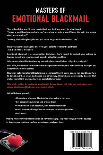 If Someone You Love Makes You Act Out Of Guilt, It's Not A Good Sign - Here's What To Do! "I'm old and sick, and I'll get a heart attack and die if you won't do what I want." "You're a worthless husband who can't even buy his wife a new iPhone. Oh wait. You simply don't love me, right?" "I nearly died while giving birth to you. Now, be grateful and do what I say" Have you heard anything like this from your parents or romantic partners? This is emotional blackmail. And it's just as bad as the name implies. Emotional blackmail is a manipulation technique that's meant to control your actions by tapping into strong emotions such as guilt, obligation, and fear. It may appear innocent, but in fact it's a huge red flag. If you give in once or twice, the blackmailer's demands will become more and more outrageous. For example, they may skillfully isolate you from your social circle or force you to give up things that bring you joy. If they do it slowly enough, you won't even notice that you're being cut off from your support network and basically held hostage! Why do emotional blackmailers try to manipulate you with fear, obligation, and guilt? First of all, because it's such an effective manipulation technique! If done skillfully, it can put you under their absolute control. However, not all emotional blackmailers are inherently evil - some people just don't know how to talk about their wants and needs in a direct way. Others have a personality disorder that makes them think blackmailing is an acceptable behavior. Of course, this doesn't mean you should tolerate it! This book, written by acclaimed psychologist Emory Green, will help you understand your unique situation and find smart ways to deal with it. With this book, you will:Understand why your blackmailer is behaving in this way Deal with emotional blackmailing in your family Recognize a manipulative romantic partner before they get hold of you Set personal boundaries and protect them Communicate in an assertive, non-defensive manner Build the mental toughness necessary to resist manipulation Realize if YOU are emotionally blackmailing someone - and STOP doing it Dealing with emotional blackmail can be very challenging. Emotional blackmail usually comes from the people we love most, such as parents and romantic partners, and it can be very painful to realize that they've been manipulating you for years. Sometimes, if the blackmailer won't change their behavior, you have no other choice but to terminate the relationship - and this can be an extremely difficult decision, especially if you have to cut a parent out of your life. But remember that you're doing this to save yourself - you're not a bad son or daughter! This book will give you the courage to listen to your intuition, confront your abusers, and make hard decisions if necessary.Scroll up, click the "Buy Now with 1-Click" button and Get Your Copy Now!