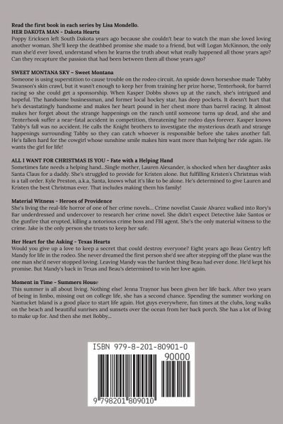Get started with the Masters of Romance: Start Me Up Series First Collection. Read the first book in each series by Lisa Mondello. There is something for everyone whether you love contemporary romance, western romance, romantic suspense or coming of age stories. HER DAKOTA MAN - Dakota Hearts Poppy Ericksen left South Dakota years ago because she couldn't bear to watch the man she loved loving another woman. She'll keep the deathbed promise she made to a friend, but will Logan McKinnon, the only man she'd ever loved, understand when he learns the truth about what really happened all those years ago? Can they recapture the passion that had been between them all those years ago? SWEET MONTANA SKY – Sweet Montana Someone is using superstition to cause trouble on the rodeo circuit. An upside down horseshoe made Tabby Swanson's skin crawl, but it wasn't enough to keep her from training her prize horse, Tenterhook, for barrel racing so she could get a sponsorship. When Kasper Dobbs shows up at the ranch, she's intrigued and hopeful. The handsome businessman, and former local hockey star, has deep pockets. It doesn't hurt that he's devastatingly handsome and makes her heart pound in her chest more than barrel racing. It almost makes her forget about the strange happenings on the ranch until someone turns up dead, and she and Tenterhook suffer a near-fatal accident in competition, threatening her rodeo days forever. Kasper knows Tabby's fall was no accident. He calls the Knight brothers to investigate the mysterious death and strange happenings surrounding Tabby so they can catch whoever is responsible before she takes another fall. He's fallen hard for the cowgirl whose sunshine smile makes him want more than helping her ride again. He wants the girl for life! ALL I WANT FOR CHRISTMAS IS YOU - Fate with a Helping Hand Sometimes fate needs a helping hand...Single mother, Lauren Alexander, is shocked when her daughter asks Santa Claus for a daddy. She's struggled to provide for Kristen alone. But fulfilling Kristen's Christmas wish is a tall order. Kyle Preston, a.k.a, Santa, knows what it's like to be alone. He's determined to give Lauren and Kristen the best Christmas ever. That includes making them his family! Material Witness - Heroes of Providence She's living the real-life horror of one of her crime novels… Crime novelist Cassie Alvarez walked into Rory's Bar underdressed and undercover to research her crime novel. She didn't expect Detective Jake Santos or the gunfire that erupted, killing a notorious crime boss and FBI agent. She's the only material witness to the crime. Jake is the only person she trusts to keep her safe. Her Heart for the Asking - Texas Hearts Would you give up a love to keep a secret that could destroy everyone? Eight years ago Beau Gentry left Mandy for life in the rodeo. She never dreamed the first person she'd see after stepping off the plane was the one man she'd never stopped loving. Leaving Mandy was the hardest thing Beau had ever done. He'd kept his promise. But Mandy's back in Texas and Beau's determined to win her love again. Moment in Time - Summers House This summer is all about living. Nothing else! Jenna Traynor has been given her life back. After two years of being in limbo, missing out on college life, she has a second chance. Spending the summer working on Nantucket Island is a good place to start life again. Hot guys everywhere, fun times at the clubs, long walks on the beach and beautiful sunrises and sunsets over the ocean from her back porch. She has a lot of living to make up for. And then she met Bobby...