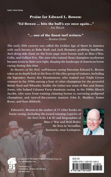 The early 20th century was called the Golden Age of Sport in America with such heroes as Babe Ruth and Jack Dempsey grabbing headlines. And alongside them on the front page were horses such as Man o' War, Colin, and Gallant Fox. The men who trained these champion racehorses became icons in their right, shaping the landscape of American horse racing during this time. In Masters of the Turf, well-known racing historian Edward L. Bowen takes an in-depth look at the lives of this elite group of trainers, including the legendary Sunny Jim Fitzsimmons, who trained two Triple Crown winners in the 1930s among a host of other champions for the powerful Belair Stud and Wheatley Stable; the father-son team of Ben and Jimmy Jones, who helped Calumet Farm dominate racing in the 1940s; and turn-of-the-century masters James Rowe and Sam Hildreth.