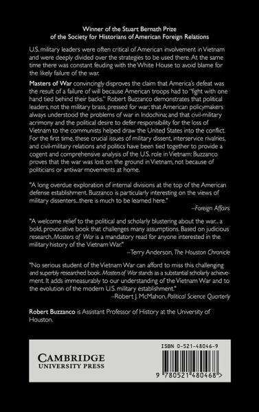 Throughout the Vietnam War, military officials such as Matthew Ridgway, James Gavin, Maxwell Taylor, Harold K. Johnson, Wallace Greene, Victor Krulak, and John Paul Vann consistently warned against the peril of waging conventional war in Vietnam, while even advocates of U.S. involvement like William Westmoreland and Earle Wheeler recognized the political and military obstacles to American success. Within the armed forces, there was further division over the Army-devised strategy of attrition, as well as constant feuding with the White House to avoid blame for the likely failure in Indochina. Masters of War convincingly disproves the claim that America's defeat was the result of a failure of will because national leaders, principally Lyndon B. Johnson, forced the troops to "fight with one hand tied behind their backs". Robert Buzzanco demonstrates that political leaders, not the military brass, pressed for war; that American policy makers always understood the problems of war in Indochina; and that civil-military acrimony and the political desire to defer responsibility for Vietnam helped draw the United States into the conflict. For the first time, these crucial issues of military dissent, interservice rivalries, and civil-military relations and politics have been tied together to provide a cogent and comprehensive analysis of the U.S. role in Vietnam: Buzzanco proves that the war was lost on the ground in Vietnam, not because of politicians or antiwar movements at home.