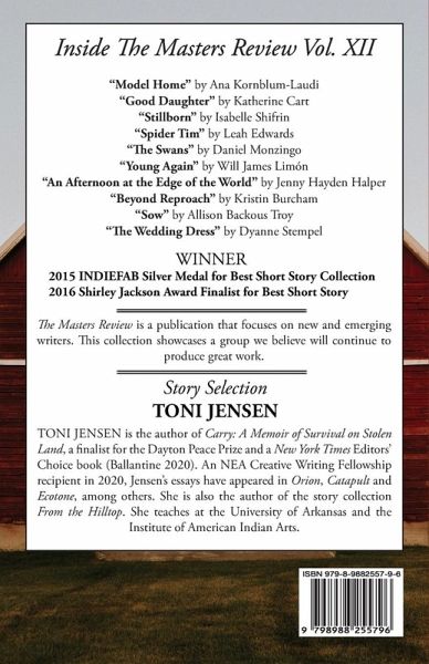 The Masters Review Anthology Volume XII collects ten stories and essays from the best emerging writers around the world, selected by guest judge Toni Jensen. In this anthology, you'll find stories about good daughters and difficult mothers, unfaithful partners and dutiful grandchildren. They'll take you to peppermint distilleries and exotic zoos, all the way to the edge of the world. Take a chance on these emerging masters of craft, and we promise you'll be surprised. Featured in this anthology: Ana Kornblum-Laudi ¿ Katherine Cart ¿ Isabelle Shifrin ¿ Leah Edwards ¿ Daniel Monzingo ¿ Will James Limón ¿ Jenny Hayden Halper ¿ Kristin Burcham ¿ Allison Backous Troy ¿ Dyanne Stempel