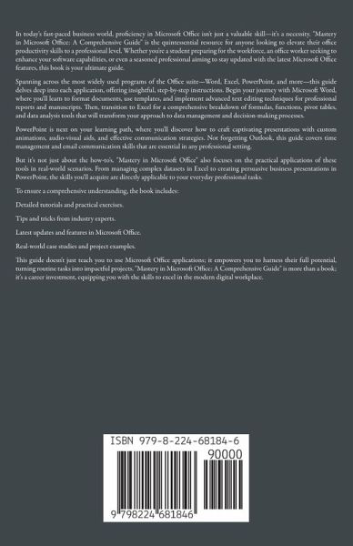 In today's fast-paced business world, proficiency in Microsoft Office isn't just a valuable skill-it's a necessity. "Mastery in Microsoft Office: A Comprehensive Guide" is the quintessential resource for anyone looking to elevate their office productivity skills to a professional level. Whether you're a student preparing for the workforce, an office worker seeking to enhance your software capabilities, or even a seasoned professional aiming to stay updated with the latest Microsoft Office features, this book is your ultimate guide. Spanning across the most widely used programs of the Office suite-Word, Excel, PowerPoint, and more-this guide delves deep into each application, offering insightful, step-by-step instructions. Begin your journey with Microsoft Word, where you'll learn to format documents, use templates, and implement advanced text editing techniques for professional reports and manuscripts. Then, transition to Excel for a comprehensive breakdown of formulas, functions, pivot tables, and data analysis tools that will transform your approach to data management and decision-making processes. PowerPoint is next on your learning path, where you'll discover how to craft captivating presentations with custom animations, audio-visual aids, and effective communication strategies. Not forgetting Outlook, this guide covers time management and email communication skills that are essential in any professional setting. But it's not just about the how-to's. "Mastery in Microsoft Office" also focuses on the practical applications of these tools in real-world scenarios. From managing complex datasets in Excel to creating persuasive business presentations in PowerPoint, the skills you'll acquire are directly applicable to your everyday professional tasks. To ensure a comprehensive understanding, the book includes: Detailed tutorials and practical exercises. Tips and tricks from industry experts. Latest updates and features in Microsoft Office. Real-world case studies and project examples. This guide doesn't just teach you to use Microsoft Office applications; it empowers you to harness their full potential, turning routine tasks into impactful projects. "Mastery in Microsoft Office: A Comprehensive Guide" is more than a book; it's a career investment, equipping you with the skills to excel in the modern digital workplace.