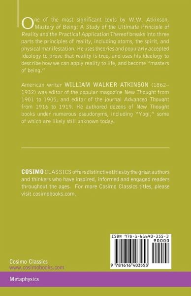 One of the most significant texts by W.W. Atkinson, Mastery of Being: A Study of the Ultimate Principle of Reality and the Practical Application Thereof breaks into three parts the principles of reality, including atoms, the spirit, and physical manifestation. He uses theories and popularly accepted ideology to prove that reality is true, and uses his ideology to describe how we can apply reality to life, and become "masters of being." American writer WILLIAM WALKER ATKINSON (1862-1932) was editor of the popular magazine New Thought from 1901 to 1905, and editor of the journal Advanced Thought from 1916 to 1919. He authored dozens of New Thought books under numerous pseudonyms, including "Yogi," some of which are likely still unknown today.