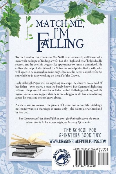 To the London ton, Cameron MacNeill is an awkward, wallflower of a man with no hope of finding a wife. But the Highland chief holds deadly secrets, and he uses his beggar-like appearance to remain unnoticed. He enlists the help of the School for Spinsters to help him find a wife who will agree to be married in name only-because he needs a mother for his son while he is away working on behalf of the Crown. Lady Ashleigh Pryor will do anything to escape the abusive household of her father-even marry a man she barely knows. But Cameron's lightning reflexes, the powerful muscles he hides behind ill-fitting clothing, and his mysterious manner suggest that he is not a beggar at all, but a man hiding a past he wants no one to know about. As she starts to uncover the pieces of Cameron's secret life, Ashleigh no longer wants a marriage in name only-she wants a true husband in her bed. But Cameron can't let himself fall in love-for if his wife learns the truth about who he is, his secrets might put her very life at stake. The School for Spinsters Book 1 - A Match Made in London Book 2 - Match Me, I'm Falling Book 3 - Match Me If You Can