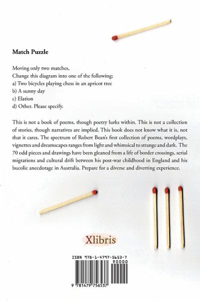 This is not a book of poems, though poetry lurks within. This is not a collection of stories, though narratives are implied. This book does not know what it is, not that it cares. The spectrum of Robert Bean¿s first collection of poems, wordplays, vignettes and dreamscapes ranges from light and whimsical to strange and dark. The 70 odd pieces and drawings have been gleaned from a life of border crossings, serial migrations and cultural drift between his post-war childhood in England and his bucolic anecdotage in Australia. Prepare for a diverse and diverting experience.