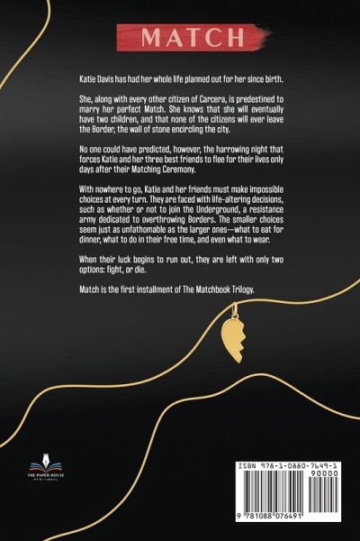 Katie Davis has had her whole life planned out for her since birth.She, along with every other citizen of Carcera, is predestined to marry her perfect Match. She knows that she will eventually have two children, and that none of the citizens will never leave the Border, the wall of stone encircling the city.No one could have predicted, however, the harrowing night that forces Katie and her three best friends to flee for their lives only days after their Matching Ceremony.With nowhere to go, Katie and her friends must make impossible choices at every turn. They are faced with life-altering decisions, such as whether or not to join the Underground, a resistance army dedicated to overthrowing Borders. The smaller choices seem just as unfathomable as the larger ones-what to eat for dinner, what to do in their free time, and even what to wear.When their luck begins to run out, they are left with only two options: fight, or die.Match is the first installment of The Matchbook Trilogy.
