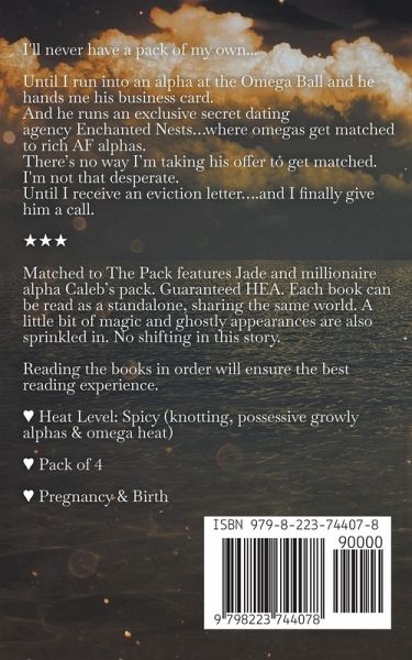 Jade I'll never have a pack of my own... Until I run into an alpha at the Omega Ball and he hands me his business card. And he runs an exclusive secret dating agency Enchanted Nests…where omegas get matched to rich AF alphas. There's no way I'm taking his offer to get matched. I'm not that desperate. Until I receive an eviction letter….and I finally give him a call. Matched to The Pack features Jade and millionaire alpha Caleb's pack. Guaranteed HEA. Each book can be read as a standalone, sharing the same world. A little bit of magic and ghostly appearances are also sprinked in. No shifting in this story. Reading the books in order will ensure the best reading experience. ♥ Heat Level: Spicy (knotting, possessive growly alphas & omega heat) ♥ Pack of 4 ♥ Pregnancy & Birth ♥ Plenty of praises ♥ No MM