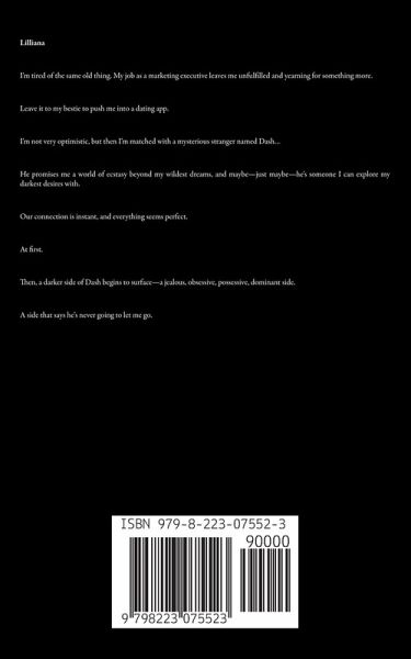 Lilliana I'm tired of the same old thing. My job as a marketing executive leaves me unfulfilled and yearning for something more. Leave it to my bestie to push me into a dating app. I'm not very optimistic, but then I'm matched with a mysterious stranger named Dash… He promises me a world of ecstasy beyond my wildest dreams, and maybe—just maybe—he's someone I can explore my darkest desires with. Our connection is instant, and everything seems perfect. At first. Then, a darker side of Dash begins to surface—a jealous, obsessive, possessive, dominant side. A side that says he's never going to let me go.