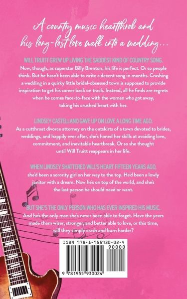 A country music heartthrob and his long-lost love walk into a wedding... Will Truitt grew up living the saddest kind of country song. Now, though, as superstar Billy Brenton, his life is perfect. Or so people think. But he hasn't been able to write a decent song in months. Crashing a wedding in a quirky little bridal-obsessed town is supposed to provide inspiration to get his career back on track. Instead, all he finds are regrets when he comes face-to-face with the woman who got away, taking his crushed heart with her. Lindsey Castellano gave up on love a long time ago. As a cutthroat divorce attorney on the outskirts of a town devoted to brides, weddings, and happily ever after, she's honed her skills at avoiding love, commitment, and inevitable heartbreak. Or so she thought until Will Truitt reappears in her life. When Lindsey shattered Will's heart fifteen years ago, she'd been a sorority girl on her way to the top. He'd been a lowly janitor with a dream. Now he's on top of the world, and she's the last person he should need or want. But she's the only person who has ever inspired his music. And he's the only man she's never been able to forget. Have the years made them wiser, stronger, and better able to love, or this time, will they simply crash and burn harder?