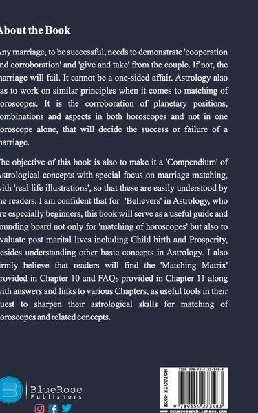 Any marriage, needs to demonstrate 'cooperation and corroboration', and 'give and take' from the couple to be successful. If not, the marriage will fail. It cannot be a one-sided affair. Astrology also has to work on similar principles when it comes to matching of horoscopes. It is the corroboration of planetary positions, combinations, and aspects in both horoscopes and not in one horoscope alone that will decide the success or failure of a marriage. The illustrative horoscopes of 'successful marriages' and their analysis in Chapter 9 clearly prove this point. The objective of this book is also to make it a 'compendium' of astrological concepts with special focus on marriage matching, with 'real life illustrations', so that these are easily understood by the readers. I am confident that for 'believers' in astrology, especially for those who are beginners, this book will serve as a useful guide and sounding board not only for 'matching of horoscopes' but also to evaluate post-marital life, including childbirth and prosperity, besides understanding other basic concepts in astrology. I also firmly believe that readers will find the 'matching matrix' provided in Chapter 10 and FAQs provided in Chapter 11 along with answers and links to various chapters useful tools in their quest to sharpen their astrological skills for matching of horoscopes and related concepts.