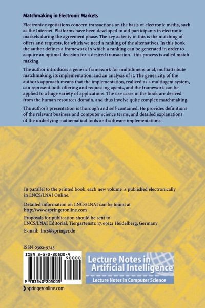 Electronic negotiations concern transactions on the basis of electronic media, such as the Internet. Platforms have been developed to aid participants in electronic markets during the agreement phase. The key activity in this is the matching of offers and requests, for which we need a ranking of the alternatives. In this book the author defines a framework in which a ranking can be generated in order to acquire an optimal decision for a desired transaction - this process is called matchmaking.