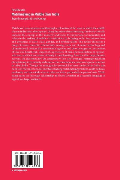 This book is an extensive and thorough exploration of the ways in which the middle class in India select their spouse. Using the prism of matchmaking, this book critically unpacks the concept of the 'modern' and traces the importance of moralities and values in the making of middle class identities, by bringing to the fore intersections and dynamics of caste, class, gender, and neoliberalism. The author discusses a range of issues: romantic relationships among youth, use of online technology and of professional services like matrimonial agencies and detective agencies, encounters of love and heartbreak, impact of experiences of pain and humiliation on spouse-selection, and the involvement of family in matchmaking. Based on this comprehensive account, she elucidates how the categories of 'love' and 'arranged' marriages fall short of explaining, in its entirety and essence, the contemporary process of spouse-selection in urban India. Though the ethnographic research has been conductedin India, this book is of relevance to social scientists studying matchmaking practices, youth cultures, modernity and the middle class in other societies, particularly in parts of Asia. While being based on thorough scholarship, the book is written in accessible language to appeal to a larger audience.