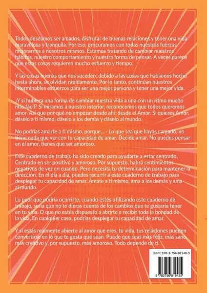 Este cuaderno de trabajo "Ámate a ti mismo" tiene como objetivo ayudarte a ser positivo y amoroso. Ofrece formularios diarios durante 12 semanas para facilitar que el amor por ti mismo, por todo y por todos, así como por el mundo, sea mayor. Todos buscamos constantemente el amor. Sin embargo, amarnos a nosotros mismos parece ser un problema. Si nos amáramos a nosotros mismos, no necesitaríamos perseguir a los demás para que nos amen. Pero olvidamos que ser positivo y amoroso comienza con cada uno de nosotros. Si eres positivo y amoroso, haces lo mejor para ti, para los demás y para el mundo. En este cuaderno de trabajo vas a responder a preguntas sencillas, pero poderosas, para aumentar la conciencia de tu propio amor.
