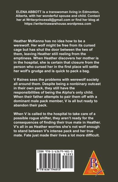 Heather McKenna has no idea how to be a werewolf. Her wolf might be free from its cursed cage but has shut the door between the two of them, leaving Heather still reeling from the emptiness. When Heather discovers her mother is in the hospital, she is certain that closure from the person who cursed her in the first place will settle her wolf's grudge and is quick to pack a bag. V Raines sees the problems with werewolf society all around them. Despite being a nonbinary outcast in their own pack, they still have the responsibilities of being the Alpha's only child. When their father attempts to pair them off with a dominant male pack member, V is all but ready to abandon their pack. When V is called to the hospital to take care of a possible rogue shifter, they aren't ready for the consequences of finding their true mate in Heather. V's all in as Heather worries she's not wolf enough to stand between V's intense pack and her true mate. Fate just made their lives a lot more difficult.