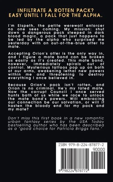 Infiltrate a rotten pack? Easy until I fall for the alpha. I'm Elspeth, the petite werewolf enforcer no one sees coming. My mission: shut down a dangerous pack steeped in dark blood magic, a pack that just happens to be led by the alpha who surprised me yesterday with an out-of-the-blue offer to mate. Accepting Orion's offer is the only way in, and I figure a mate bond can be broken as easily as it's created. This mate bond, however, immediately spirals out of control. Mysterious tattoos pop up on both of our arms, awakening lethal new powers within me and threatening to destroy everything I once believed in. Because Orion's pack isn't rotten, and Orion is no criminal. He's my fated mate. Now the corrupt Council I once served hunts both of us while we race to unlock the mate bond's powers. Will embracing our connection be our salvation, or will it hasten the bloody end for my pack and my mate? Don't miss this first book in a new romantic urban fantasy series by the USA Today bestselling author who has been described as a "good choice for Patricia Briggs fans."