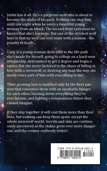Justin has it all. He's a gorgeous wolf who is about to become the alpha of his pack. Nothing can stop him, until one night when he saves a beautiful young woman from an attack. The second their eyes meet he knows that she's his mate. But one of the strictest wolf laws is that no wolf can ever mate with a human - the penalty is death... Carly is a young woman dedicated to the life-path she's made for herself; going to college on a hard-won scholarship, determined to get a degree and begin a career. But she never factored in the chaos of falling in love with a werewolf, or desiring any man the way she needs every part of him with everything in her. Their growing love is matched only by the fiery passion that consumes them with an insatiable hunger for each other, burning down everything they've ever known, and lighting a tempestuous future they cannot imagine. If they stay together it will cost them more than their lives, but nothing can keep them apart, except the whole werewolf world. Secrets and skin are continuously uncovered as the stakes grow ever more dangerous, and the ecstasy endlessly hotter!