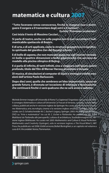 Il primo numero.- Il primo numero.- matematica e infinito.- L'idea di infinito: osservazioni storiche e filosofiche.- Lo strano concetto di punto materiale.- matematica, forme e architettura.- Dai radiolari ai vasi di Gallé.- L'architettura delle bolle di sapone.- Topologia e spazio storico: il museo del mondo ellenico, Atene.- Un politopo pubblico a Venezia.- Una bolla a quattro dimensioni.- matematica e giocattoli.- Tecnologia, matematica e la cultura dei bambini.- matematica e arte.- In cammino verso l'autenticazione digitale.- Simmetrie fronte-retro in manufatti tessili del periodo pre-Inca.- Cosmogonie.- matematica e psichiatria.- La mente matematica.- matematica e fumetto.- Matematica e narrativa.- matematica e musica.- Il cambiamento di paradigmi nella relazione tra matematica e musica tra il tardo Medioevo e il Rinascimento.- Simple mapping e la dimensione estetica.- La metafora nella matematica e nel suono.- matematica e applicazioni.- L'acchiapparella ed altri giochi (differenziali).- Il girasole di Fibonacci.- I modelli matematici per la previsione meteorologica.- matematica e medicina.- Evoluzione dell'istopatologia: da flatlandia a una visione a tre dimensioni.- matematica, Cina e Giappone.- Matteo Ricci: un gesuita matematico alla corte dei Ming.- La proporzione e la dimensione della mente: il giardino zen del Ry?an-ji, Ky?to.- matematica e teatro.- Star Messengers e Delicious Rivers: rappresentare concetti matematici a teatro.- omaggio a Peter Greenaway.- Sembrerebbe che una tale magia potesse accadere soltanto a Venezia.- Senza titolo.- 92 drawings of water.- Matematica e cultura dieci anni dopo: un bilancio.
