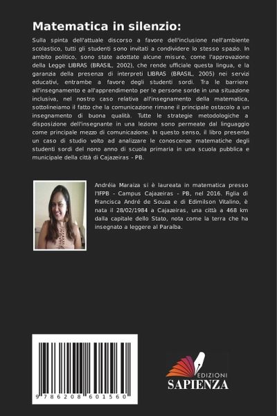 Sulla spinta dell'attuale discorso a favore dell'inclusione nell'ambiente scolastico, tutti gli studenti sono invitati a condividere lo stesso spazio. In ambito politico, sono state adottate alcune misure, come l'approvazione della Legge LIBRAS (BRASIL, 2002), che rende ufficiale questa lingua, e la garanzia della presenza di interpreti LIBRAS (BRASIL, 2005) nei servizi educativi, entrambe a favore degli studenti sordi. Tra le barriere all'insegnamento e all'apprendimento per le persone sorde in una situazione inclusiva, nel nostro caso relativa all'insegnamento della matematica, sottolineiamo il fatto che la comunicazione rimane il principale ostacolo a un insegnamento di buona qualità. Tutte le strategie metodologiche a disposizione dell'insegnante in una lezione sono permeate dal linguaggio come principale mezzo di comunicazione. In questo senso, il libro presenta un caso di studio volto ad analizzare le conoscenze matematiche degli studenti sordi del nono anno di scuola primaria in una scuola pubblica e municipale della città di Cajazeiras - PB.