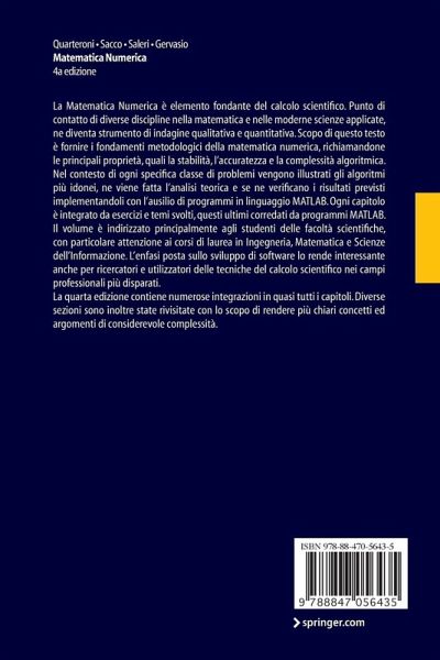 Nel contesto di ogni specifica classe di problemi vengono illustrati gli algoritmi più idonei, ne viene fatta l'analisi teorica e se ne verificano i risultati previsti implementandoli con l'ausilio di programmi in linguaggio MATLAB. Ogni capitolo è integrato da esercizi e temi svolti, questi ultimi corredati da programmi MATLAB. Il volume è indirizzato principalmente agli studenti delle facoltà scientifiche, con particolare attenzione ai corsi di laurea in Ingegneria, Matematica e Scienze dell'Informazione. L'enfasi posta sullo sviluppo di software lo rende interessante anche per ricercatori e utilizzatori delle tecniche del calcolo scientifico nei campi professionali più disparati.