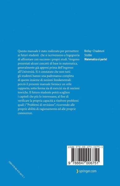 Questo manuale è stato realizzato per permettere ai futuri studenti di Ingegneria di affrontare con successo i propri studi. Vengono presentati alcuni concetti di base in matematica, generalmente già appresi prima dell'ingresso all'Università. Si è constatato che non tutti gli studenti hanno una padronanza completa di questo insieme di nozioni fondamentali: perciò il presente manuale fornisce un utile supporto, sotto forma sia di esercizi sia di nozioni teoriche. Il futuro studente potrà scegliere i capitoli che più lo interessano, al fine di verificare la propria capacità a risolvere problemi quali i "Problemi di revisione", ricorrendo alle proprie abilità di ragionamento ed alle proprie conoscenze.
