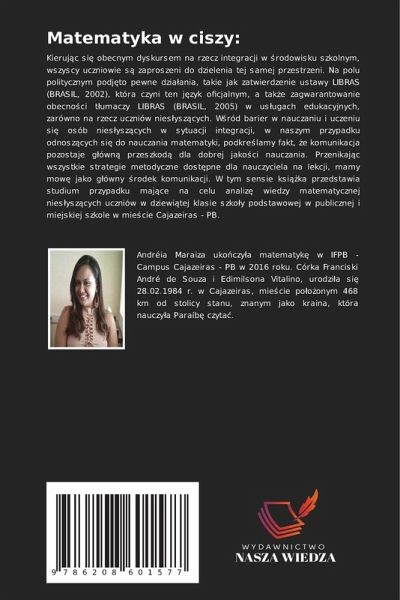 Kieruj¿c si¿ obecnym dyskursem na rzecz integracji w ¿rodowisku szkolnym, wszyscy uczniowie s¿ zaproszeni do dzielenia tej samej przestrzeni. Na polu politycznym podj¿to pewne dziäania, takie jak zatwierdzenie ustawy LIBRAS (BRASIL, 2002), która czyni ten j¿zyk oficjalnym, a tak¿e zagwarantowanie obecno¿ci t¿umaczy LIBRAS (BRASIL, 2005) w us¿ugach edukacyjnych, zarówno na rzecz uczniów nies¿ysz¿cych. W¿ród barier w nauczaniu i uczeniu si¿ osób nies¿ysz¿cych w sytuacji integracji, w naszym przypadku odnosz¿cych si¿ do nauczania matematyki, podkre¿lamy fakt, ¿e komunikacja pozostaje g¿ówn¿ przeszkod¿ dla dobrej jako¿ci nauczania. Przenikaj¿c wszystkie strategie metodyczne dost¿pne dla nauczyciela na lekcji, mamy mow¿ jako g¿ówny ¿rodek komunikacji. W tym sensie ksi¿¿ka przedstawia studium przypadku maj¿ce na celu analiz¿ wiedzy matematycznej nies¿ysz¿cych uczniów w dziewi¿tej klasie szko¿y podstawowej w publicznej i miejskiej szkole w mie¿cie Cajazeiras - PB.