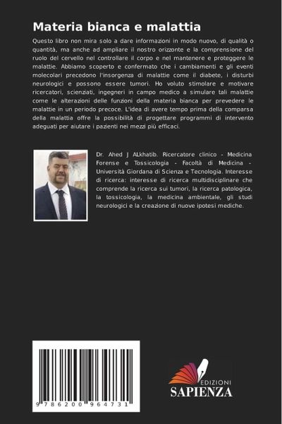 Questo libro non mira solo a dare informazioni in modo nuovo, di qualità o quantità, ma anche ad ampliare il nostro orizzonte e la comprensione del ruolo del cervello nel controllare il corpo e nel mantenere e proteggere le malattie. Abbiamo scoperto e confermato che i cambiamenti e gli eventi molecolari precedono l'insorgenza di malattie come il diabete, i disturbi neurologici e possono essere tumori. Ho voluto stimolare e motivare ricercatori, scienziati, ingegneri in campo medico a simulare tali malattie come le alterazioni delle funzioni della materia bianca per prevedere le malattie in un periodo precoce. L'idea di avere tempo prima della comparsa della malattia offre la possibilità di progettare programmi di intervento adeguati per aiutare i pazienti nei mezzi più efficaci.