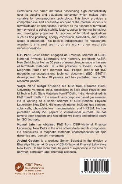R.P. Pant, Chief Editor; Engaged as Emeritus Scientist at CSIR-National Physical Laboratory and honorary professor AcSIR, New Delhi, India. He has 35 years of research experience in the area of ferrofluids materials. He is the president of Indian Society of Magnetic Fluids and member ISC. Project leader for ISO magnetic nanosuspensions technical document (ISO 19807-1) development. He has 10 patents and has published nearly 200 research papers. Vidya Nand Singh obtained his MSc from Banaras Hindu University, Varanasi, India, specializing in Solid State Physics, and M.Tech in Solid State Materials from IIT Delhi, India. He obtained his Ph.D. from IIT Delhi in the area of nanocomposite based gas sensors. He is working as a senior scientist at CSIR-National Physical Laboratory, New Delhi. His research interest includes gas sensors, solar cells, photodetectors, nanomaterials, and HRTEM. He has published nearly 220 papers in international journals. He has several book chapters and has edited two books and editorial board for SCI journals. Komal Jain has obtained PhD from CSIR-National Physical Laboratory, New Delhi in the area of ferrofluids and its composites. He specializes in magnetic materials characterization for spin dynamics and domain movements. Arvind Gautam is a working Senior Scientist in the division of Bharatiya Nirdeshak Dravya of CSIR-National Physical Laboratory, New Delhi. He has more than 14 years of experience in the area of polymer, petroleum and chemical sciences.