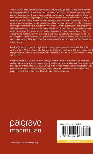 "This fascinating collection of essays, edited by Patricia Pender and Rosalind Smith, explores the material cultures of early modern women's writing as a new way of examining production, transmission and reception. ... The editors are to be congratulated for assembling such a tightly focused, conceptually vibrant and coherent volume. ... Read as a whole, the collection makes an invaluable contribution to the history of the book and adds a genuinely gendered dimension to scholarship interested in material texts." (James Daybell, English Historical Review, Vol. 131 (552), October, 2016)