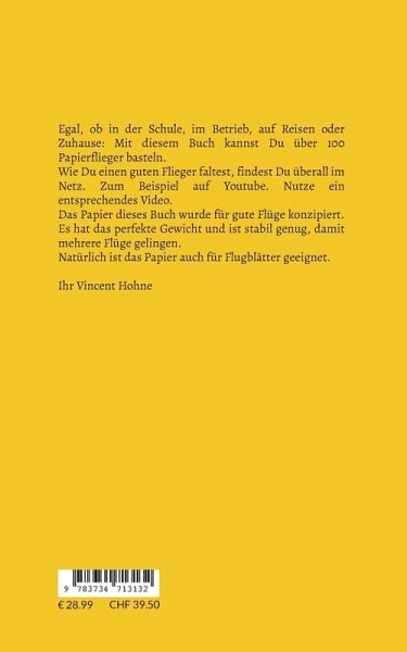 Egal, ob in der Schule, im Betrieb, auf Reisen oder Zuhause: Mit diesem Buch kannst Du über 100 Papierflieger basteln.Wie Du einen guten Flieger faltest, findest Du überall im Netz. Zum Beispiel auf Youtube. Nutze ein entsprechendes Video. Das Papier dieses Buch wurde für gute Flüge konzipiert. Es hat das perfekte Gewicht und ist stabil genug, damit mehrere Flüge gelingen. Natürlich ist das Papier auch für Flugblätter geeignet. Ihr Vincent Hohne