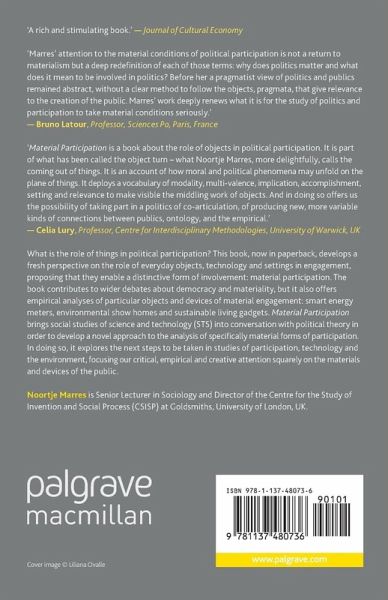 "Marres' attention to the material conditions of political participation is not a return to materialism but a deep redefinition of each of those terms: why does politics matter and what does it mean to be involved into politics? Before her a pragmatist view of politics and publics remained abstract, without a clear method to follow the objects, pragmata, that give relevance to the creation of the public. Marres' work deeply renews what it is for the study of politics and participation to take material conditions seriously." - Bruno Latour, Professor, Sciences Po, Paris, France