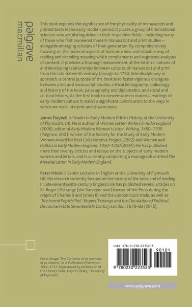 List of Illustrations Acknowledgements Note on the Contributors List of Abbreviations Introduction: Material Matters; J.Daybell & P.Hinds PART I: THE MATERIAL LETTER Losing and Regaining the Material Meanings of Epistolary and Gift Texts; C.C.Brown Secret Letters in Early Modern England; J.Daybell Copycopia, or The Uses of Copied Correspondence in Court Culture: A case study; A.Gordon PART II: THE MATERIAL BOOK: PRINT AND SOCIAL PRACTICES OF READING Possessing the Visual: The Materiality of Visual Print Culture in Later Stuart Britain; M.Knights Hackney Poets and Hireling Pamphleteers: Professional Authorship and the Book Trade in Late-Seventeenth-Century London; P.Hinds Early Modern Sermon Paratexts and the Religious Politics of Reading; M.A.Lund Textuality, Privacy and Politics: Katherine Philips's Poems in Manuscript and Print; G.Wright PART III: MATERIAL MANUSCRIPTS Neighbourhood, Social Networks, and the Making of a Family's Manuscript Poetry Collection: The Case of British Library Additional MS 25707; A.F.Marotti Casting Off Blanks: Hidden Structures in Early Modern Paper Books; J.Gibson The Early Modern University Manuscript Beyond the University; C.Burlinson 'The art of Numbering well': Late Seventeenth-Century Arithmetic Manuscripts Compiled by Quaker Girls; V.E.Burke Notes and References Index