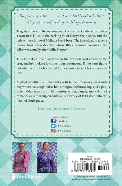 The Fall Crafters Fair has barely begun in Shipshewana when murder strikes the small town once again--this time on the property of Daisy's Quilt Shop. It will take all of the sleuthing skills Deborah Yoder and Callie Harper possess to catch the perpetrator. But the stakes are higher than ever before, since the material witness is their best friend's child. Masked identities, antique quilts with hidden messages, one brave dog, and a possible hidden treasure . . . Deborah and Callie are in for nonstop action, danger, and a dash of romance.