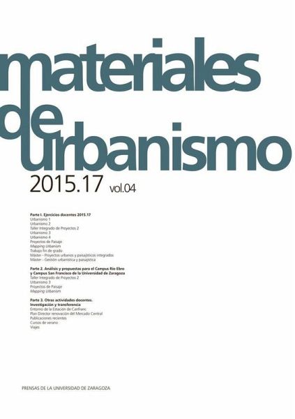 Este volumen recoge trabajos de estudiantes y profesores de distintos cursos de la titulación de Arquitectura de la Universidad de Zaragoza. Incluye los siguientes contenidos: Parte 1. Ejercicios docentes 2015.17. Urbanismo 1 (Zaragoza: Fachada del barrio de Las Fuentes hacia la huerta), Urbanismo 2 (Scalo Porta Farini. Milán. Zona Sur del Puerto de Estocolmo, Royal Seaport), Proyectos 2 (Zaragoza: Polígono 3 en torno a la Calle del Doctor Fleming), Urbanismo 3 (Ordenación de un sector o área de intervención. Monzón), Urbanismo 4 (El cauce abandonado del río Guadalope. Caspe. Ordenación territorial del municipio de Montcada i Reixac), Proyectos de Paisaje (Intervención paisajística sobre el Parking de auto caravanas, Jaca), Urban Mapping y Proyectos urbanos y paisajísticos integrados (Zaragoza: Propuestas para el barrio Oliver y para el barrio de San José) // Parte 2. Análisis y propuestas para el Campus Río Ebro y Campus San Francisco de la Universidad de Zaragoza