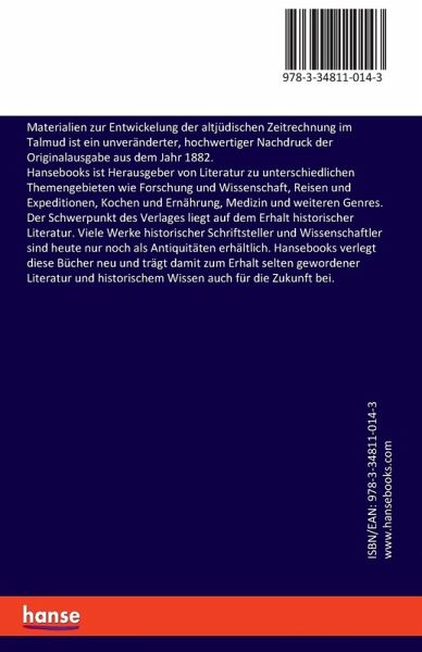 Materialien zur Entwickelung der altjüdischen Zeitrechnung im Talmud ist ein unveränderter, hochwertiger Nachdruck der Originalausgabe aus dem Jahr 1882.Hansebooks ist Herausgeber von Literatur zu unterschiedlichen Themengebieten wie Forschung und Wissenschaft, Reisen und Expeditionen, Kochen und Ernährung, Medizin und weiteren Genres. Der Schwerpunkt des Verlages liegt auf dem Erhalt historischer Literatur. Viele Werke historischer Schriftsteller und Wissenschaftler sind heute nur noch als Antiquitäten erhältlich. Hansebooks verlegt diese Bücher neu und trägt damit zum Erhalt selten gewordener Literatur und historischem Wissen auch für die Zukunft bei.