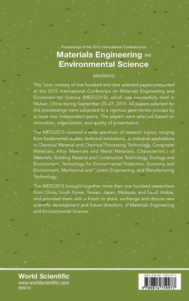This book consists of one hundred and nine selected papers presented at the 2015 International Conference on Materials Engineering and Environmental Science (MEES2015), which was successfully held in Wuhan, China during September 25–27, 2015. All papers selected for this proceedings were subjected to a rigorous peer-review process by at least two independent peers. The papers were selected based on innovation, organization, and quality of presentation. The MEES2015 covered a wide spectrum of research topics, ranging from fundamental studies, technical innovations, to industrial applications in Chemical Material and Chemical Processing Technology, Composite Materials, Alloy Materials and Metal Materials, Characteristics of Materials, Building Material and Construction Technology, Ecology and Environment, Technology for Environmental Protection, Economy and Environment, Mechanical and Control Engineering, and Manufacturing Technology. The MEES2015 brought together more than one hundred researchers from China, South Korea, Taiwan, Japan, Malaysia, and Saudi Arabia, and provided them with a forum to share, exchange and discuss new scientific development and future directions of Materials Engineering and Environmental Science.