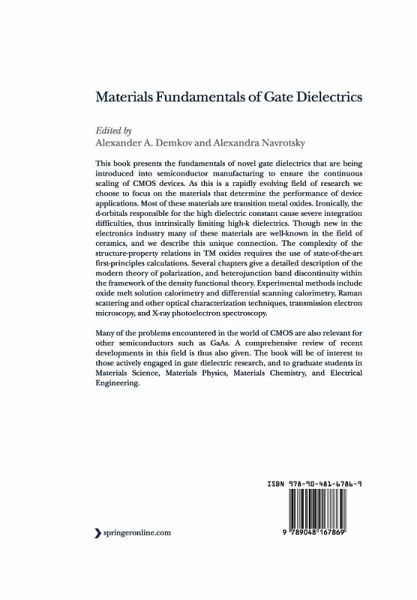 This book presents materials fundamentals of novel gate dielectrics that are being introduced into semiconductor manufacturing to ensure the continuous scalling of the CMOS devices. This is a very fast evolving field of research so we choose to focus on the basic understanding of the structure, thermodunamics, and electronic properties of these materials that determine their performance in device applications. Most of these materials are transition metal oxides. Ironically, the d-orbitals responsible for the high dielectric constant cause sever integration difficulties thus intrinsically limiting high-k dielectrics. Though new in the electronics industry many of these materials are wel known in the field of ceramics, and we describe this unique connection. The complexity of the structure-property relations in TM oxides makes the use of the state of the art first-principles calculations necessary. Several chapters give a detailed description of the modern theory of polarization, and heterojunction band discontinuity within the framework of the density functional theory. Experimental methods include oxide melt solution calorimetry and differential scanning calorimetry, Raman scattering and other optical characterization techniques, transmission electron microscopy, and x-ray photoelectron spectroscopy.