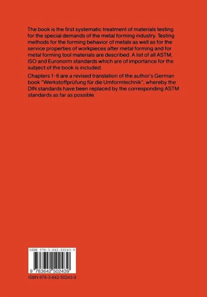 This book is addressed to both research scientists at universities and technical institutes and to engineers in the metal forming industry. It is based upon the author's experience as head of the Materials Science Department of the In stitut fUr Umformtechnik at the University of Stuttgart. The book deals with materials testing for the special demands of the metal for ming industry. The general methods of materials testing, as far as they are not directly related to metal forming, are not considered in detail since many books are available on this subject. Emphasis is put on the determination…mehr