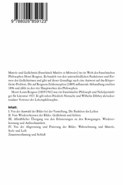 Materie und Gedächtnis (französisch Matière et Mémoire) ist ein Werk des französischen Philosophen Henri Bergson. Es handelt von den unterschiedlichen Funktionen und Formen des Gedächtnisses und gibt auf dieser Grundlage auch eine Antwort auf das Körper-Geist-Problem. Die auf Bergsons Zeitkonzeption (1889) aufbauende Abhandlung erschien 1896 und zählt zu den vier Hauptwerken des Philosophen. Henri-Louis Bergson (1859/1941) war ein französischer Philosoph und Nobelpreisträger für Literatur 1927. Er gilt neben Friedrich Nietzsche und Wilhelm Dilthey als bedeutendster Vertreter der Lebensphilosophie. Inhalt: . I. Von der Auswahl der Bilder bei der Vorstellung. Die Funktion des Leibes . II. Vom Wiedererkennen der Bilder. Gedächtnis und Gehirn . III. Allmählicher Übergang von den Erinnerungen zu den Bewegungen. Wiedererkennung und Aufmerksamkeit. . IV. Von der Abgrenzung und Fixierung der Bilder. Wahrnehmung und Materie. Seele und Leib . Zusammenfassung und Schluß