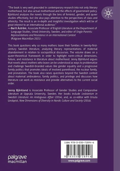 This book questions why so many mothers leave their families in twenty-first-century Swedish literature, analyzing literary representations of maternal abandonment in relation to sociopolitical discourses. The volume draws on a queer-theoretical framework in order to highlight norm-critical dimensions, failure, and resistance in literature about motherhood. Jenny Björklund argues that novels about mothers who leave can be understood as ways to problematize and challenge Swedish-branded values like gender equality and a progressive family politics that promotes ideals of involved parenthood, the nuclear family, and pronatalism. The book also raises questions beyond the Swedish context about maternal ambivalence, family politics, and privilege and discusses how literature can work as resistance and provide alternatives to the current social order.