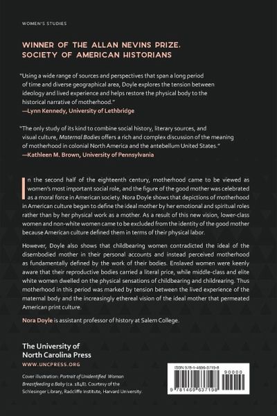 In the second half of the eighteenth century, motherhood came to be viewed as women’s most important social role, and the figure of the good mother was celebrated as a moral force in American society. Nora Doyle shows that depictions of motherhood in American culture began to define the ideal mother by her emotional and spiritual roles rather than by her physical work as a mother. As a result of this new vision, lower-class women and non-white women came to be excluded from the identity of the good mother because American culture defined them in terms of their physical labor. However, Doyle also shows that childbearing women contradicted the ideal of the disembodied mother in their personal accounts and instead perceived motherhood as fundamentally defined by the work of their bodies. Enslaved women were keenly aware that their reproductive bodies carried a literal price, while middle-class and elite white women dwelled on the physical sensations of childbearing and childrearing. Thus motherhood in this period was marked by tension between the lived experience of the maternal body and the increasingly ethereal vision of the ideal mother that permeated American print culture.