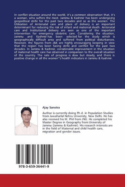 In conflict situation around the world, it¿s a common observation that, it¿s a woman, who suffers the most. Jammu & Kashmir has been undergoing geopolitical strife for the past two decades and so as the women. The Utilization of Antenatal care and place of delivery is an important determinant for reducing the risk of infant and maternal death. Antenatal care and Institutional delivery are seen as one of the important intervention for emergency obstetric care. Considering the situation, Jammu and Kashmir has been selected for the study which is geographically difficult area and suffered from political disturbances. However, the figures from J&K are highly encouraging keeping in view that the region has been facing strife and conflict for the past two decades. In Jammu & Kashmir, considerable improvement in the situation of maternal health care has observed in comparison to the overall situation of the country. The rate of progress is slow but steady, and there is positive change in all the women¿s health indicators in Jammu & Kashmir.