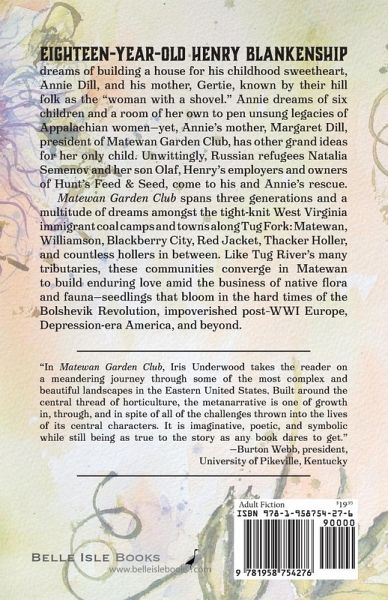 Eighteen-year-old Henry Blankenship dreams of building a house for his childhood sweetheart, Annie Dill, and his mother, Gertie, known by their hill folk as the "woman with a shovel." Annie dreams of six children and a room of her own to pen the unsung legacies of Appalachian women-yet Annie's mother, Margaret Dill, President of Matewan Garden Club, has other, bigger plans for her only child. Unwittingly, Russian refugees Natalia Semenov and her son Olaf, Henry's employers at Hunt's Feed & Seed, come to Henry and Annie's rescue. Matewan Garden Club spans three generations and a multitude of dreams amongst the tight-knit immigrant coal camps and struggling towns along Tug Fork: Williamson, Blackberry City, Red Jacket, Thacker Holler, and countless hollers in between. Like the river's many tributaries, these communities converge in Depression-era Matewan, West Virginia to build enduring love amid the business of native flora and fauna-seedlings of a post-WWI Europe in chaos, the Bolshevik Revolution-and a brand new America.