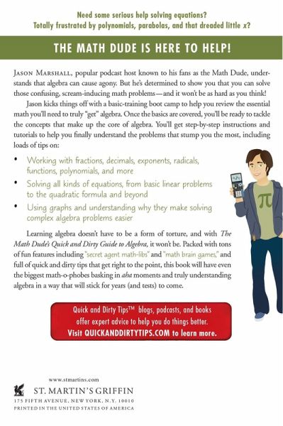 Need some serious help solving equations? Totally frustrated by polynomials, parabolas and that dreaded little x? THE MATH DUDE IS HERE TO HELP! Jason Marshall, popular podcast host known to his fans as The Math Dude, understands that algebra can cause agony. But he's determined to show you that you can solve those confusing, scream-inducing math problems--and it won't be as hard as you think! Jason kicks things off with a basic-training boot camp to help you review the essential math you'll need to truly "get" algebra. The basics covered, you'll be ready to tackle the concepts that make up the core of algebra. You'll get step-by-step instructions and tutorials to help you finally understand the problems that stump you the most, including loads of tips on: - Working with fractions, decimals, exponents, radicals, functions, polynomials and more - Solving all kinds of equations, from basic linear problems to the quadratic formula and beyond - Using graphs and understanding why they make solving complex algebra problems easier Learning algebra doesn't have to be a form of torture, and with The Math Dude's Quick and Dirty Guide to Algebra, it won't be. Packed with tons of fun features including "secret agent math-libs," and "math brain games," and full of quick and dirty tips that get right to the point, this book will have even the biggest math-o-phobes basking in a-ha moments and truly understanding algebra in a way that will stick for years (and tests) to come. Whether you're a student who needs help passing algebra class, a parent who wants to help their child meet that goal, or somebody who wants to brush up on their algebra skills for a new job or maybe even just for fun, look no further. Sit back, relax, and let this guide take you on a trip through the world of algebra.